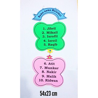HIASAN DINDING ISLAMI Nama Malaikat Bentuknya sesuai QC dari pabrik ya kak UK 54x23 CM sesuai kiriman dari pabrik Cocok untuk tempelan di dinding pintu lemari dll atau dibuat permainan seru Bahan spon CREATIVITY Tempel didinding agar buah hati menjadi hafal Nama Malaikat Produk ini dibentuk khusus seperti poster yang dapat disambungkan menggunakan klip agar anak dapat